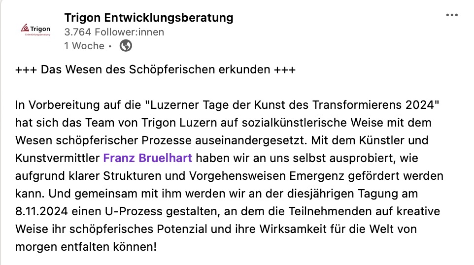Die beste Werbung für meine workshops sind natürlich die Feedbacks, die Berichte der Teilnehmer*innen. Daher in den Worten und im Bild der Trigon Mitarbeiter*innen: