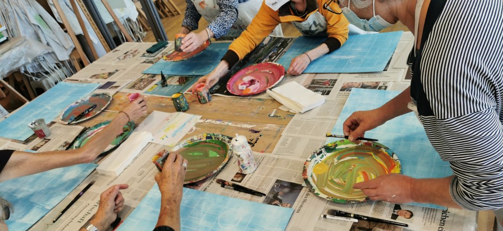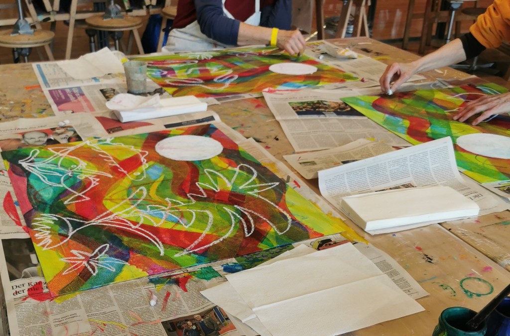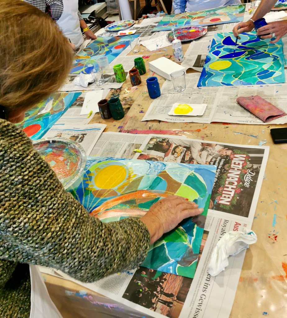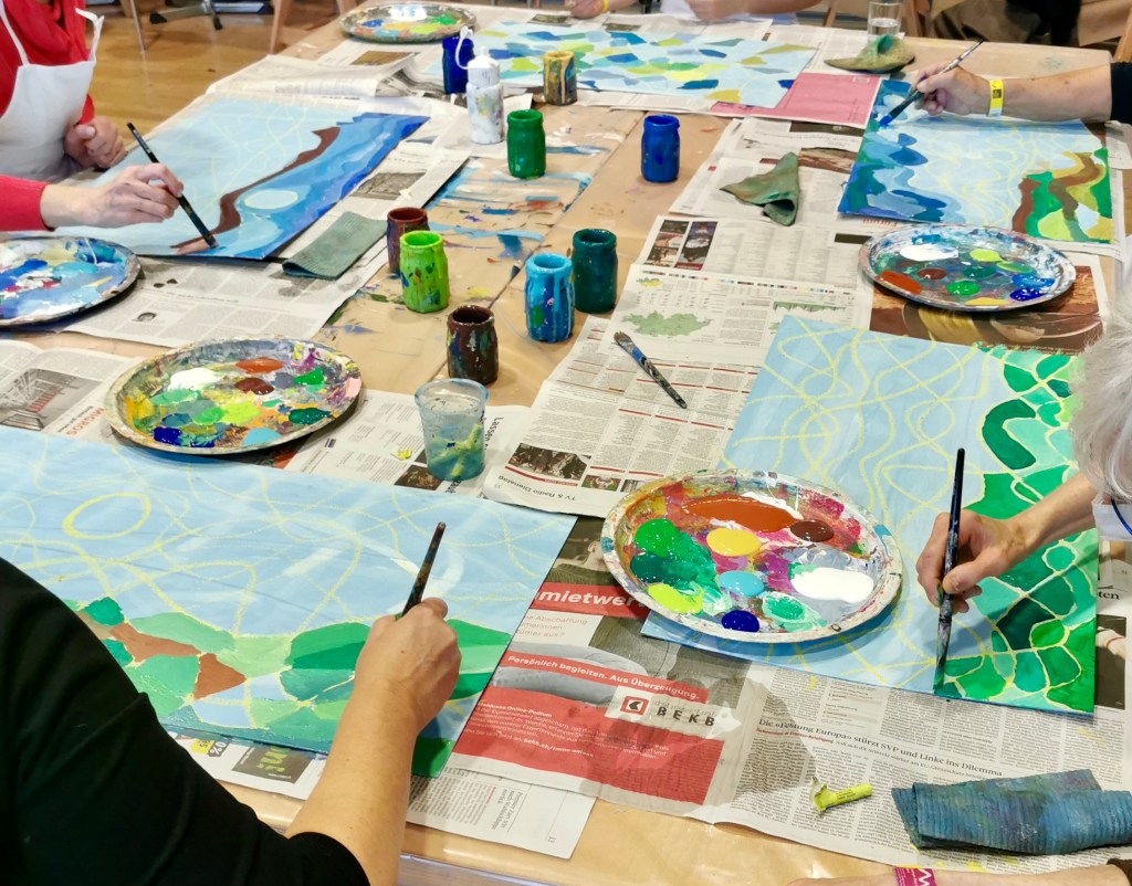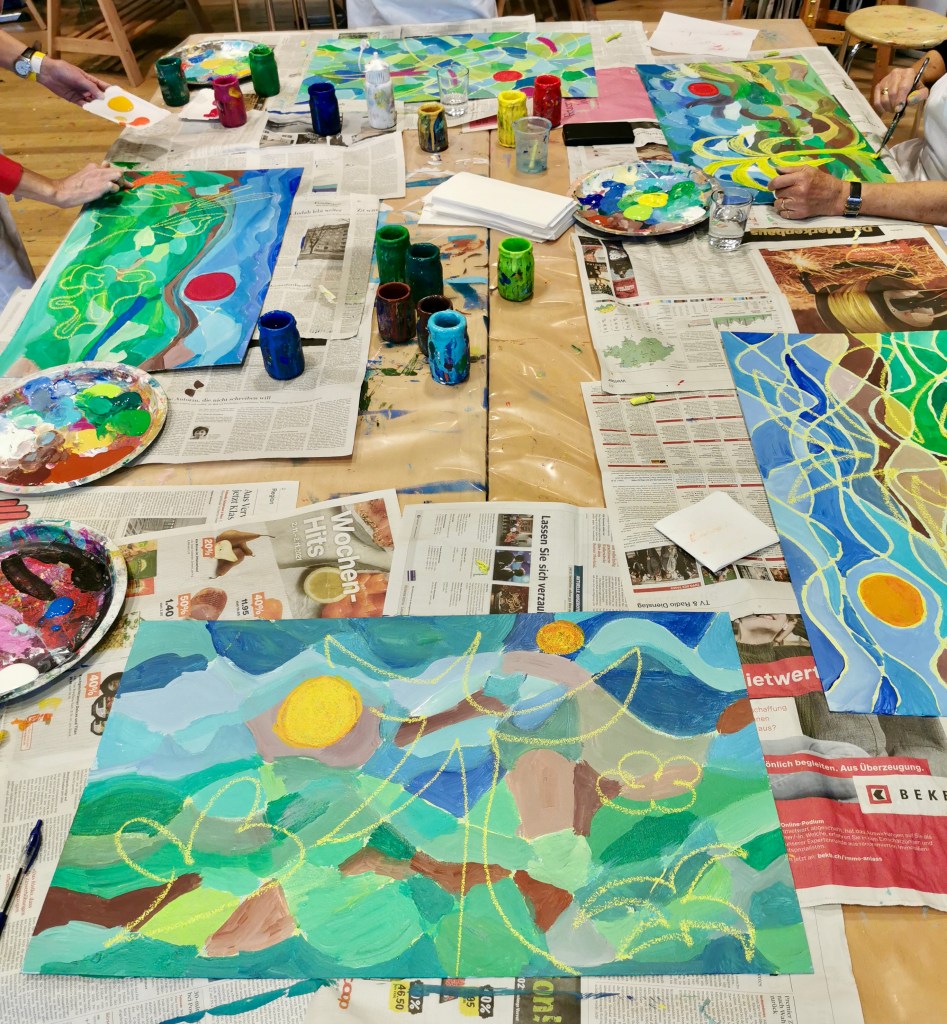 Seit einigen Jahren schon darf ich ein- oder zweimal im Jahr mit vom Krebs Betroffenen und Angehörigen arbeiten. In einem dreistündigen malerisch sinnlichen Workshop können die Teilnehmer:innen den Alltag, die Sorgen, die Krankheit hinter sich lassen.
