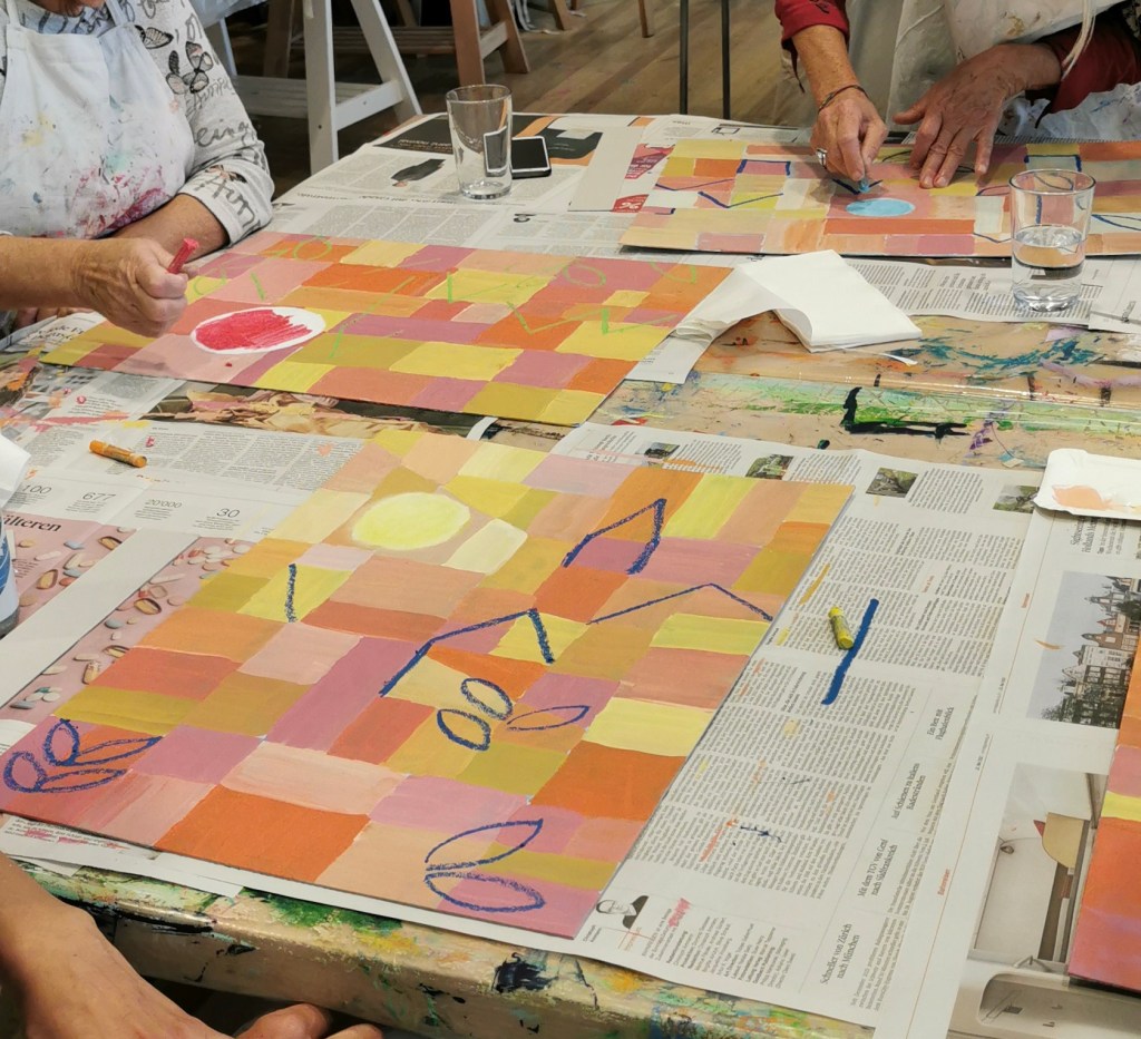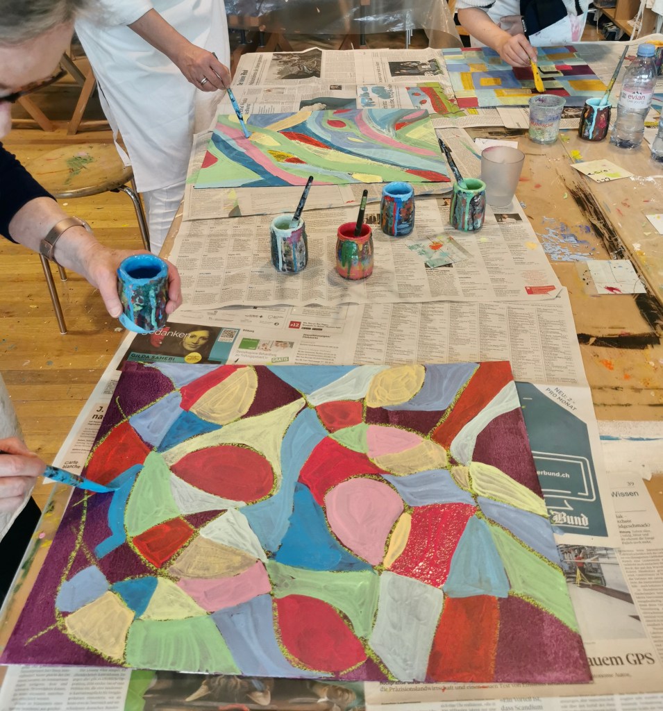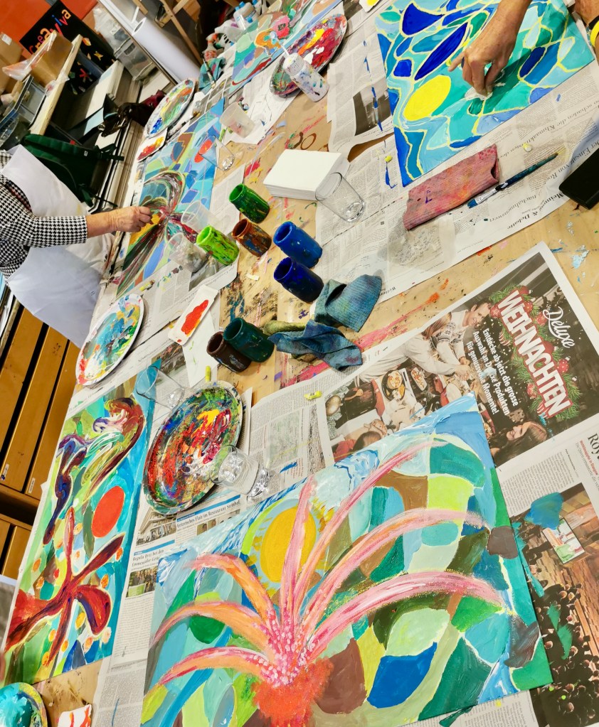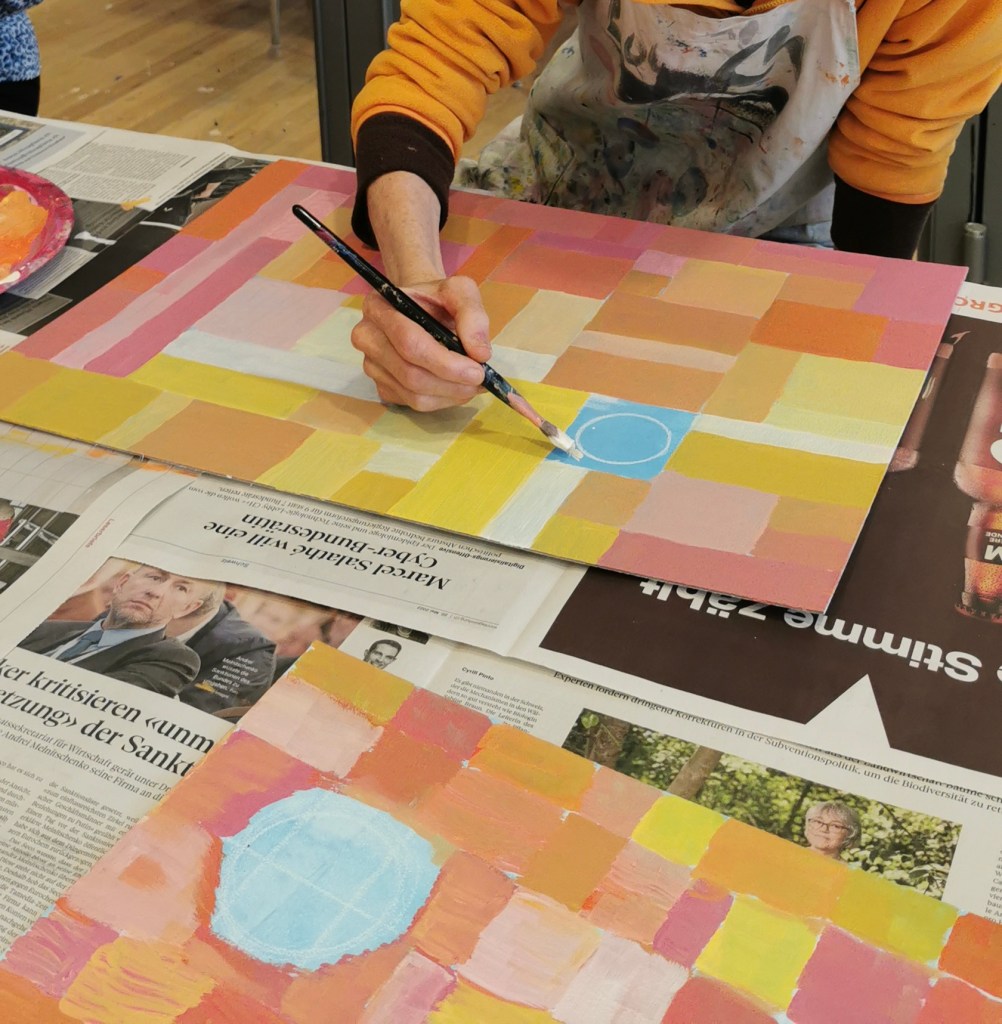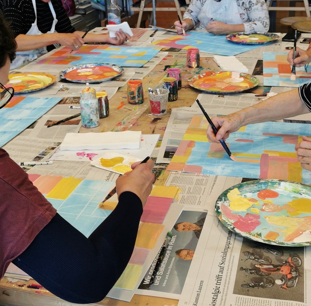 Seit einigen Jahren schon darf ich ein- oder zweimal im Jahr mit vom Krebs Betroffenen und Angehörigen arbeiten. In einem dreistündigen malerisch sinnlichen Workshop können die Teilnehmer:innen den Alltag, die Sorgen, die Krankheit hinter sich lassen.