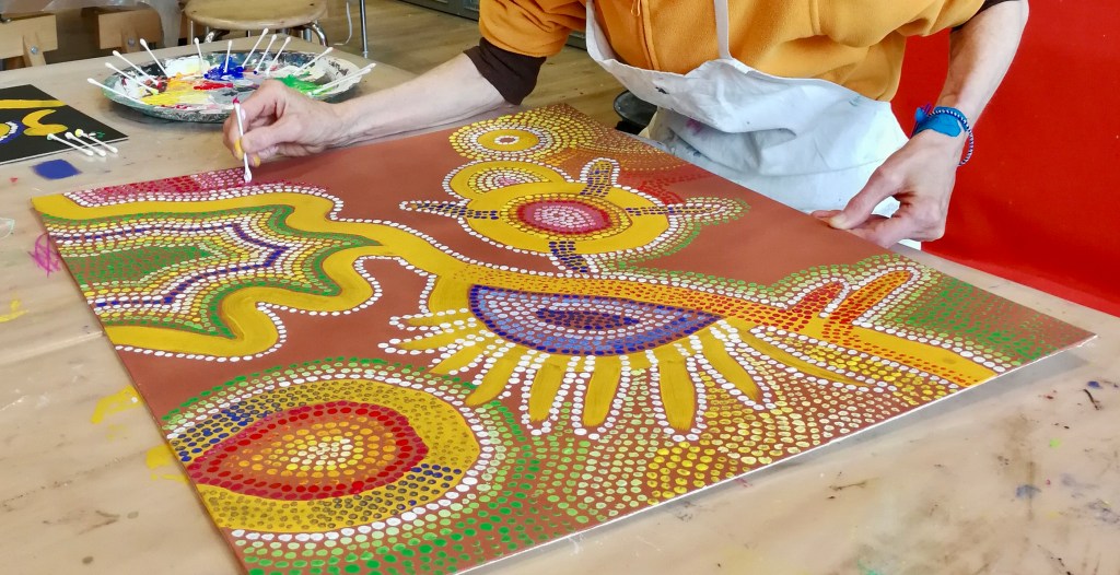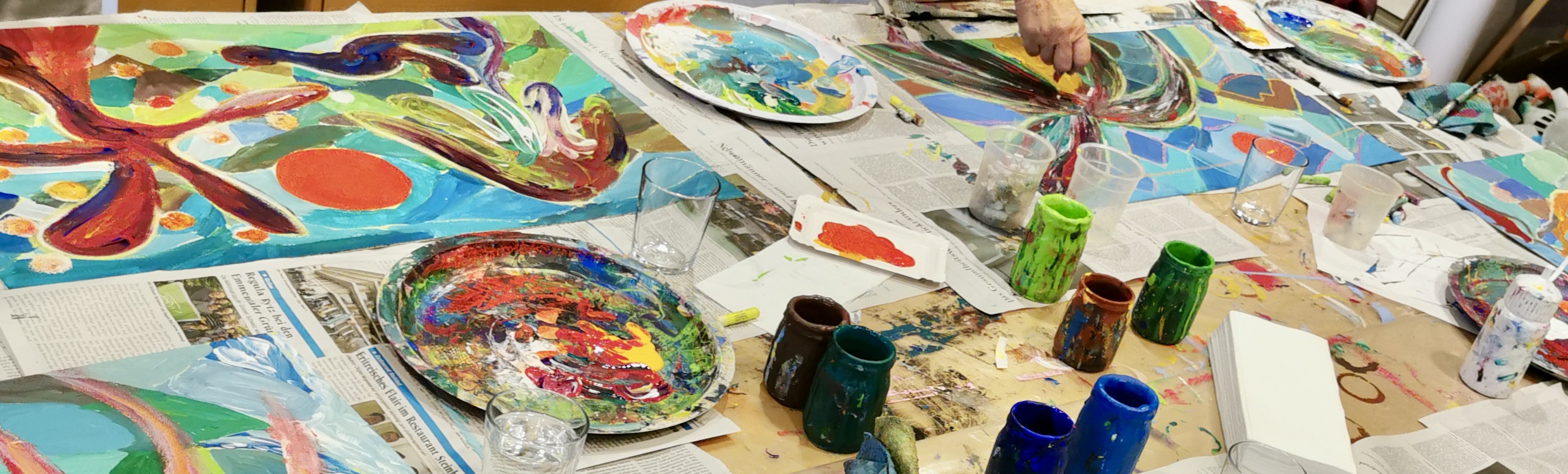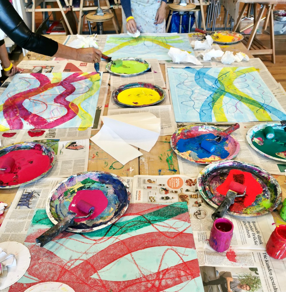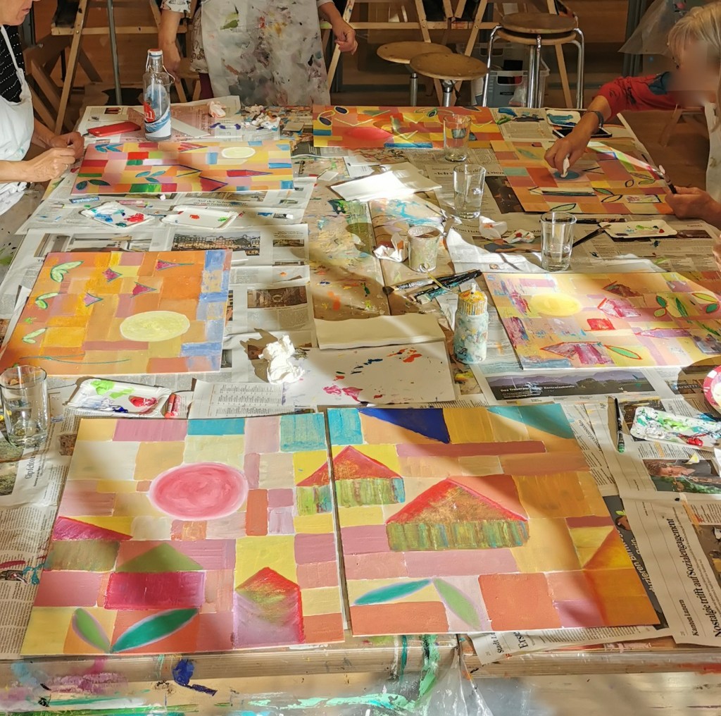 Seit einigen Jahren schon darf ich ein- oder zweimal im Jahr mit vom Krebs Betroffenen und Angehörigen arbeiten. In einem dreistündigen malerisch sinnlichen Workshop können die Teilnehmer:innen den Alltag, die Sorgen, die Krankheit hinter sich lassen.