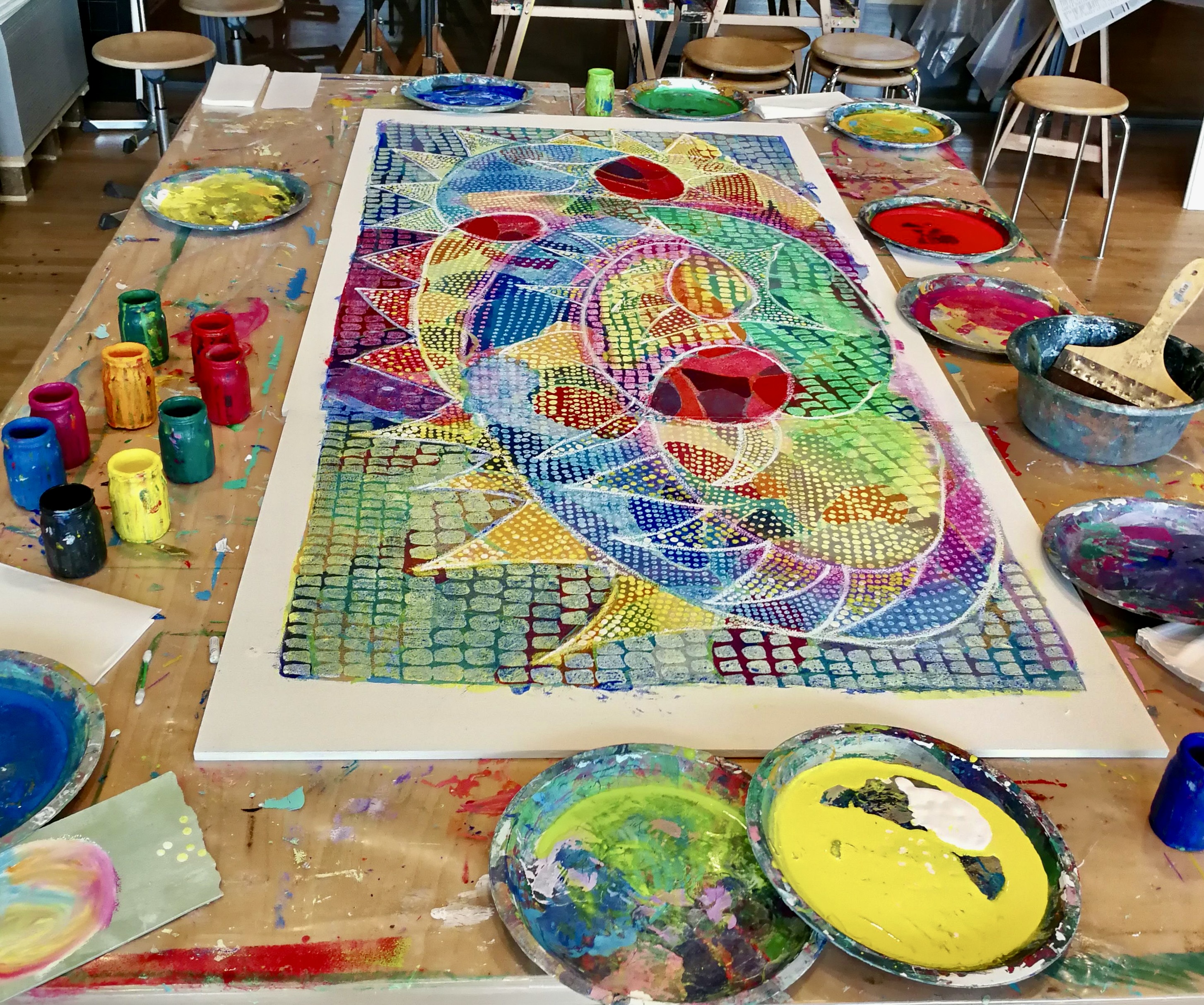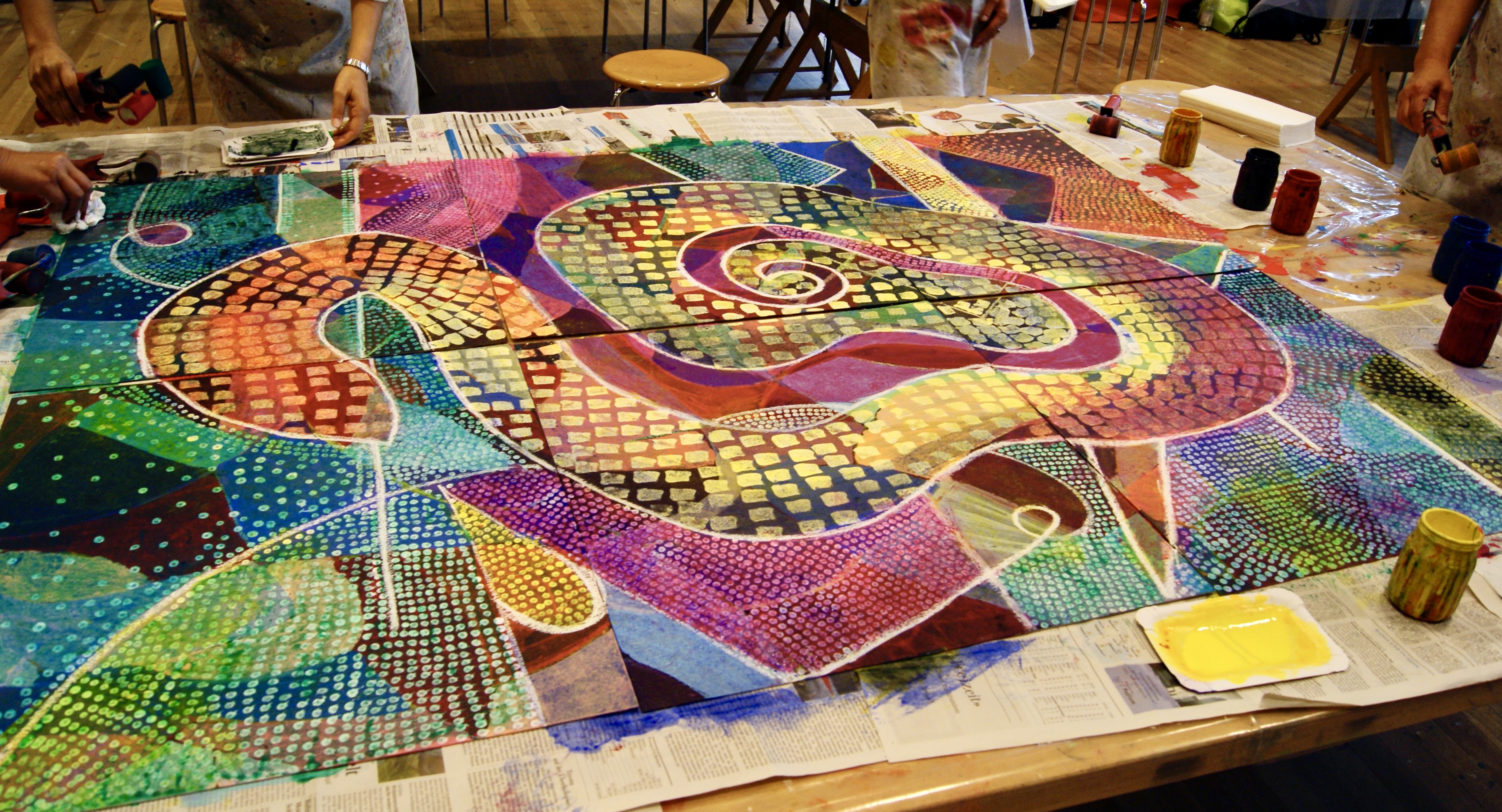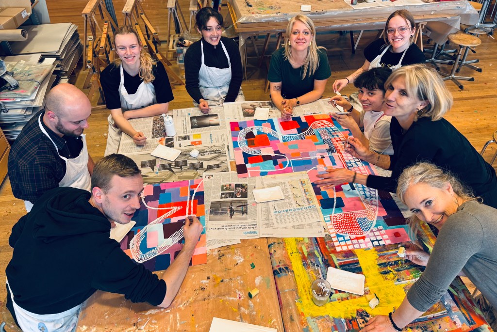 Zurück beim Workshop wurden wir sehr klar zu den nächsten technischen Schritten geführt. Für den letzten Schritt vom Individuellen wieder in das Gemeinsame fehlte aus meiner Sicht genügend Zeit. Da hier die Überraschungen entstehen und es etwas Mut braucht mit Farbe über das Bild zu rollen, hätte ich gerne noch ein bisschen langsamer gearbeitet.