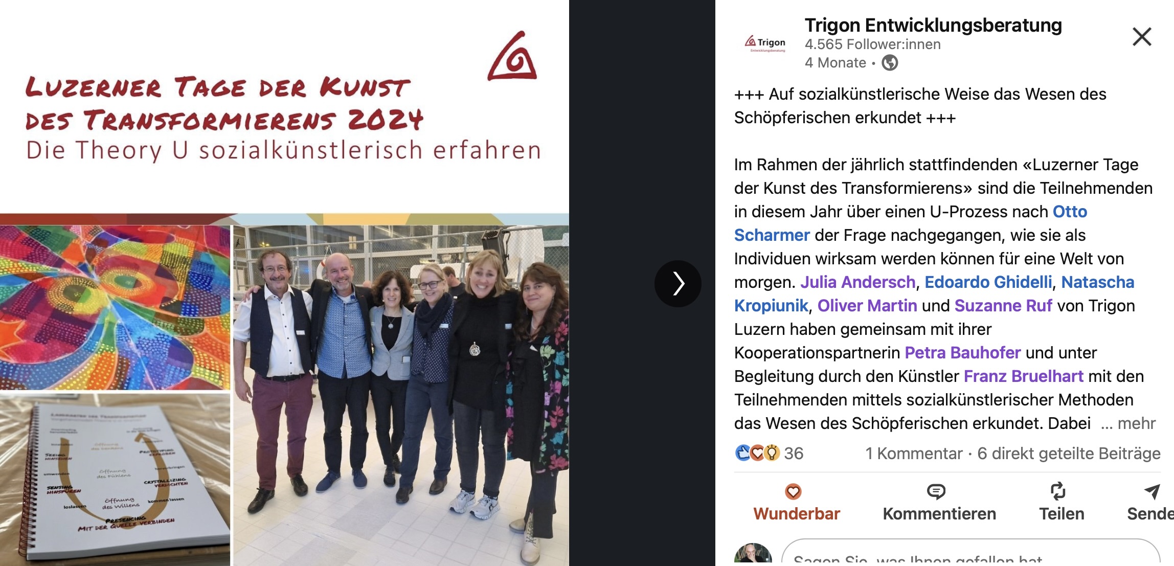 Grossartig: offenbar konnte er bestehen und so wurde ich von den syntaktisch-hypnosystemischen Entwicklunsberater:innen der Trigon eingeladen, mit ihnen ‚auf sozialkünstlerische Weise das Wesen des Schöpferischen zu erkunden‘. ‚Im Rahmen der jährlich stattfindenden «Luzerner Tage der Kunst des Transformierens» sind die Teilnehmenden in diesem Jahr über einen U-Prozess nach Otto Scharmer der Frage nachgegangen, wie sie als Individuen wirksam werden können für eine Welt von morgen.‘