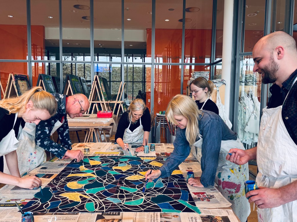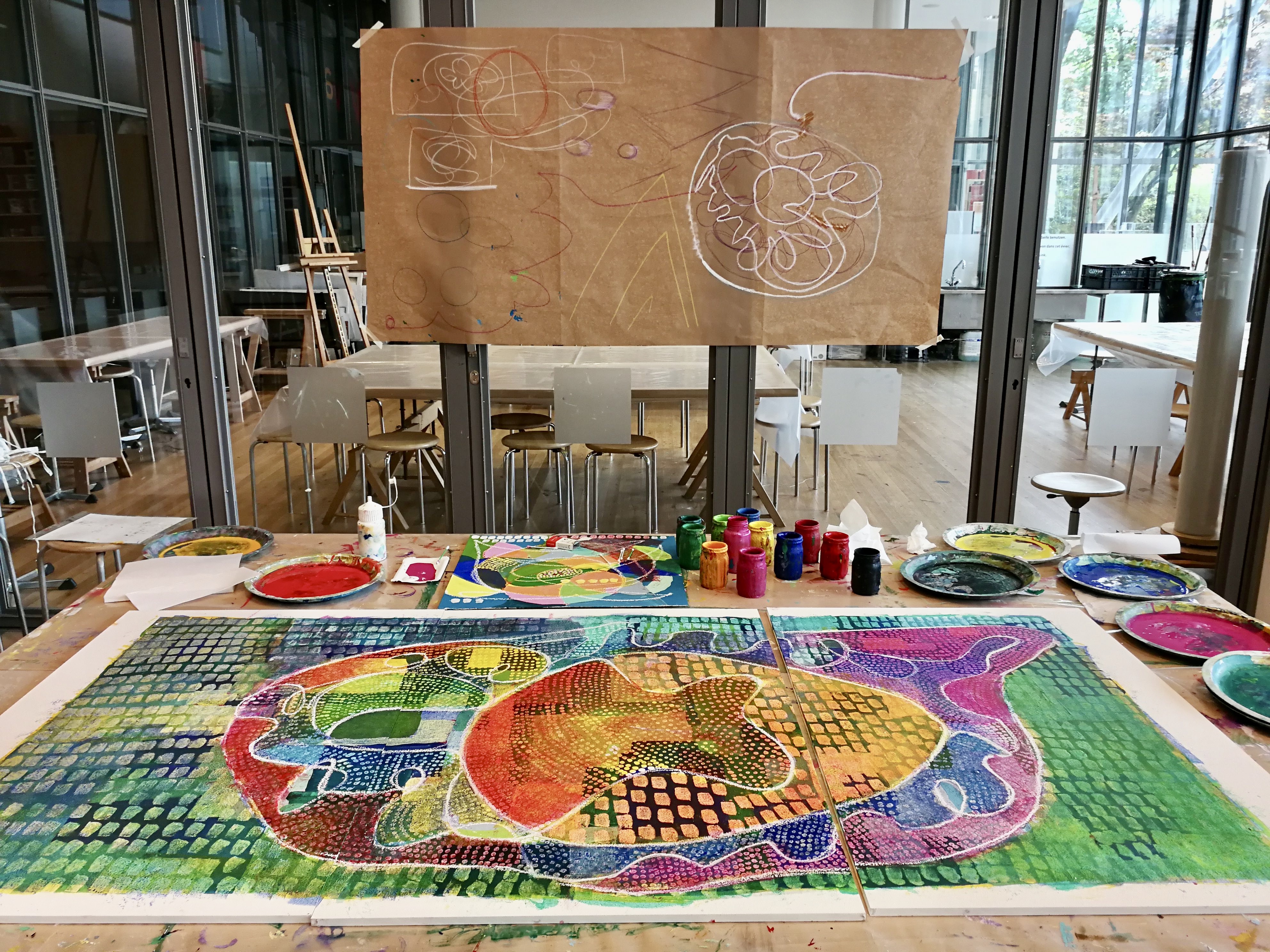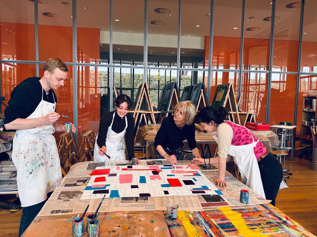 Auch von meiner Warte aus möchte ich betonen, wie sehr ich beeindruckt war, welche tolle Atmosphäre Franz dank seiner super vorbereiteten und organisierten Art in kurzer Zeit erzeugen konnte. Die Gruppe war ja sehr heterogen: sprachlich, kulturell, altersmässig, wie auch von den technischen Kenntnissen her. Wie er es scheinbar locker schaffte, zwischen Fun und Seriosität zu pendeln und die 2.5h für alle zu einem kurzweiligen Farb-Abenteuer werden zu lassen, war Sonderklasse! Fast nebenbei und ohne es richtig zu realisieren, kamen die TN in den Genuss von 5-6 Mal-Techniken, davon einige klee’sche…auch für mich sehr erbaulich! Also: Nochmals herzlichen Dank für die gute Stimmung, die Lacher und den Stolz, den alle nach Hause tragen durften – es hat gfägt!