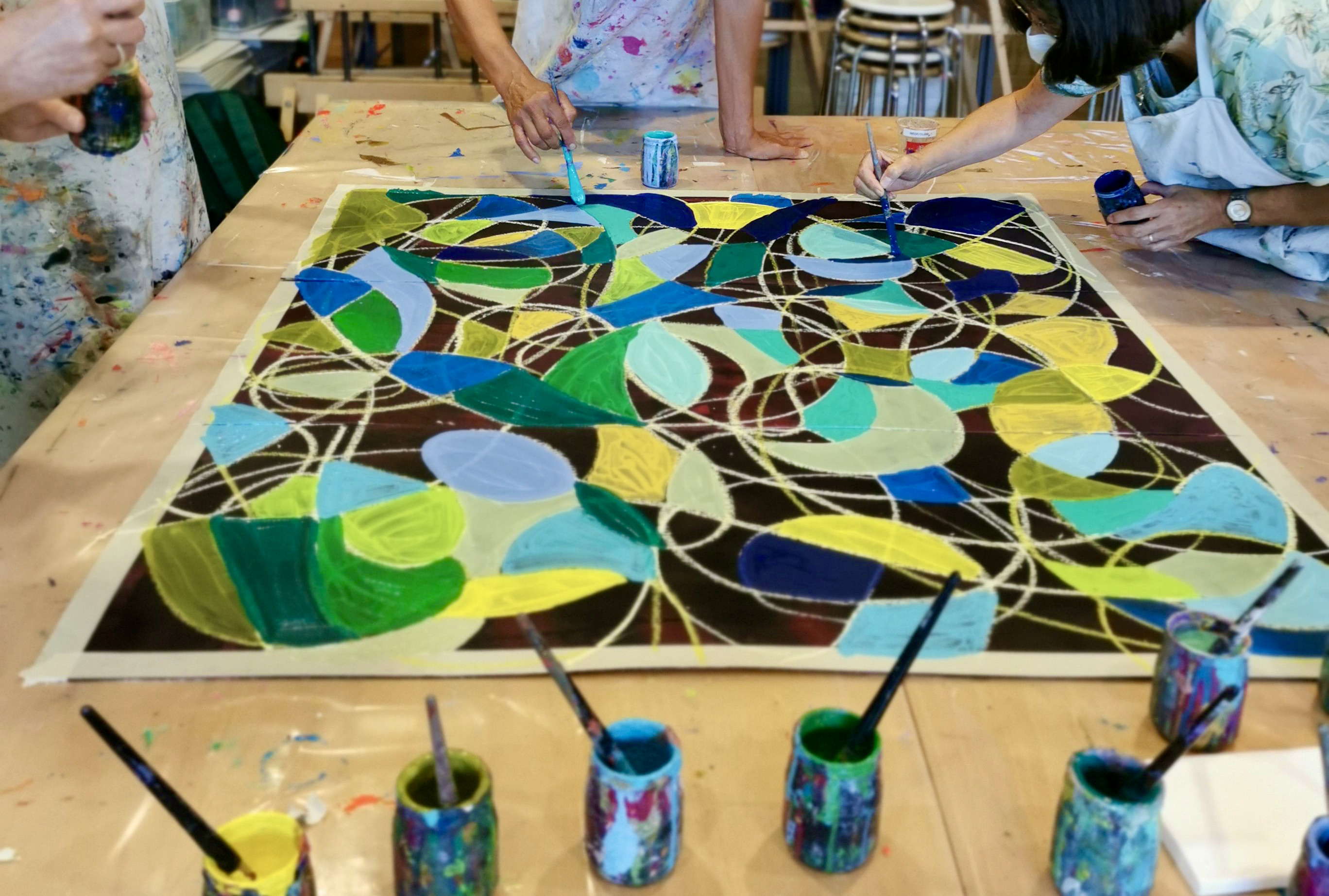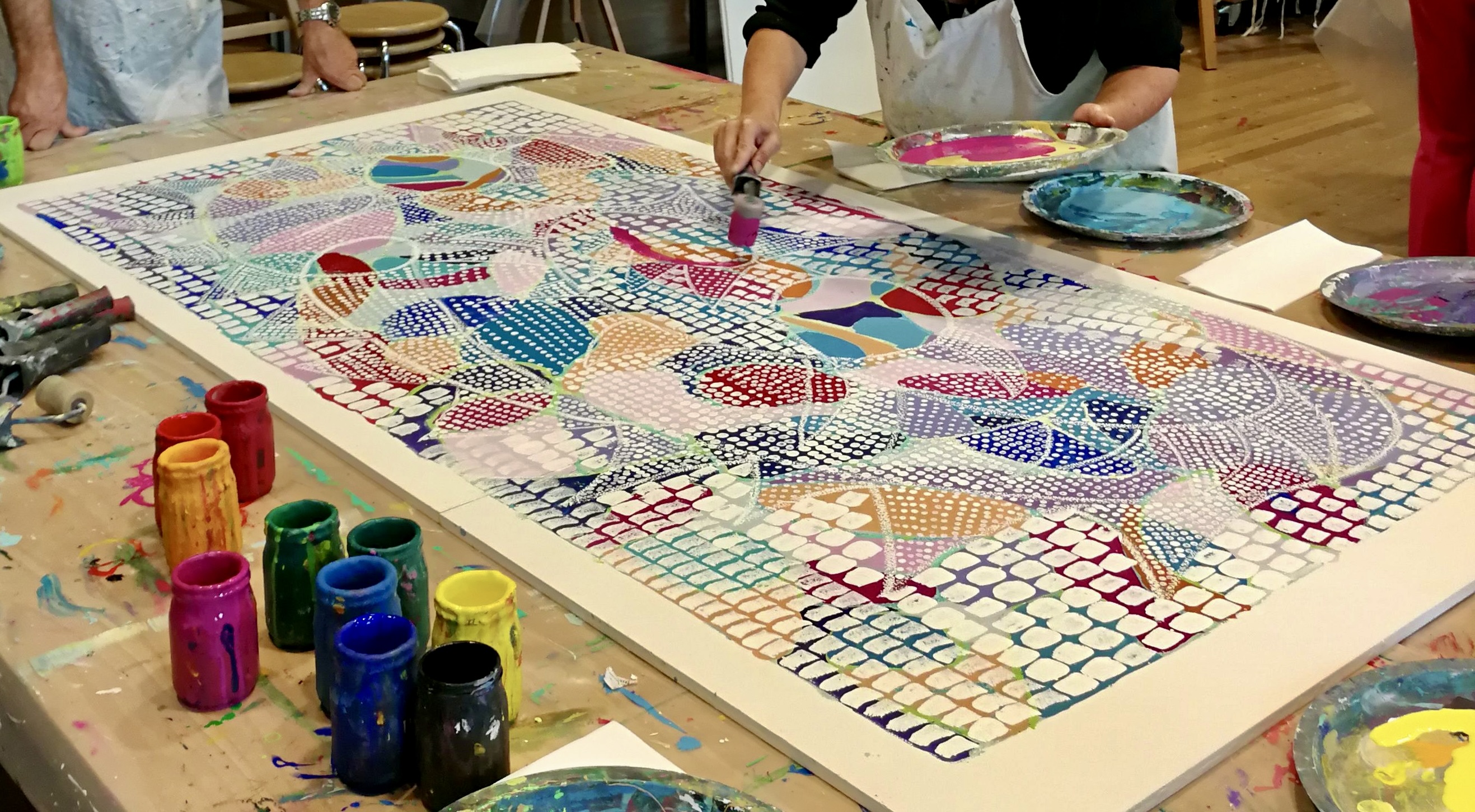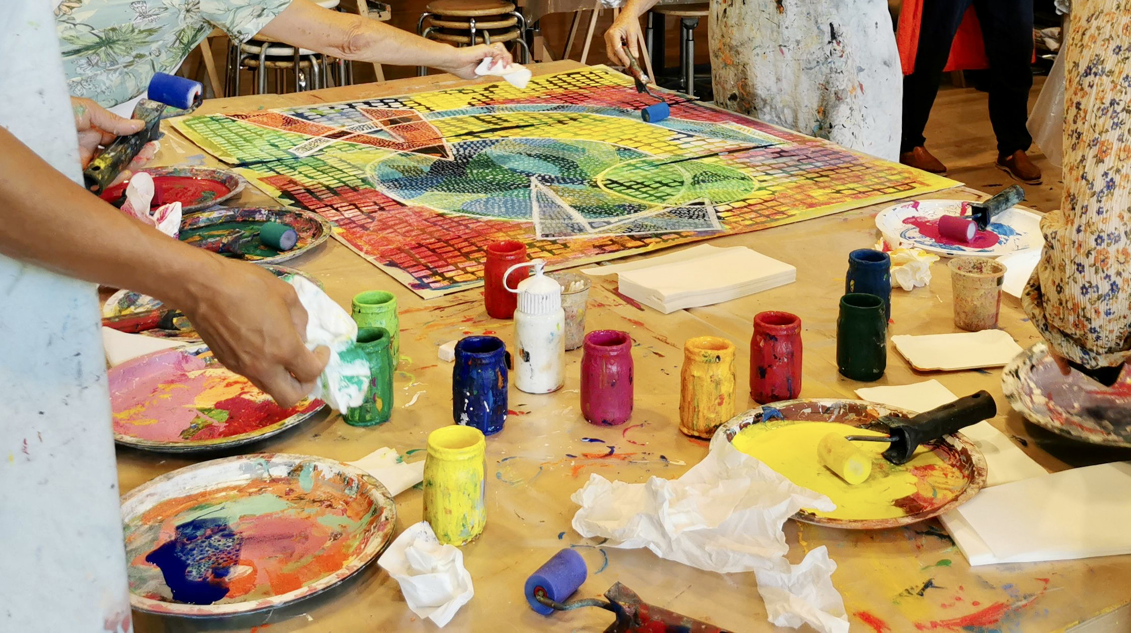Auch von meiner Warte aus möchte ich betonen, wie sehr ich beeindruckt war, welche tolle Atmosphäre Franz dank seiner super vorbereiteten und organisierten Art in kurzer Zeit erzeugen konnte. Die Gruppe war ja sehr heterogen: sprachlich, kulturell, altersmässig, wie auch von den technischen Kenntnissen her. Wie er es scheinbar locker schaffte, zwischen Fun und Seriosität zu pendeln und die 2.5h für alle zu einem kurzweiligen Farb-Abenteuer werden zu lassen, war Sonderklasse! Fast nebenbei und ohne es richtig zu realisieren, kamen die TN in den Genuss von 5-6 Mal-Techniken, davon einige klee’sche…auch für mich sehr erbaulich! Also: Nochmals herzlichen Dank für die gute Stimmung, die Lacher und den Stolz, den alle nach Hause tragen durften – es hat gfägt!