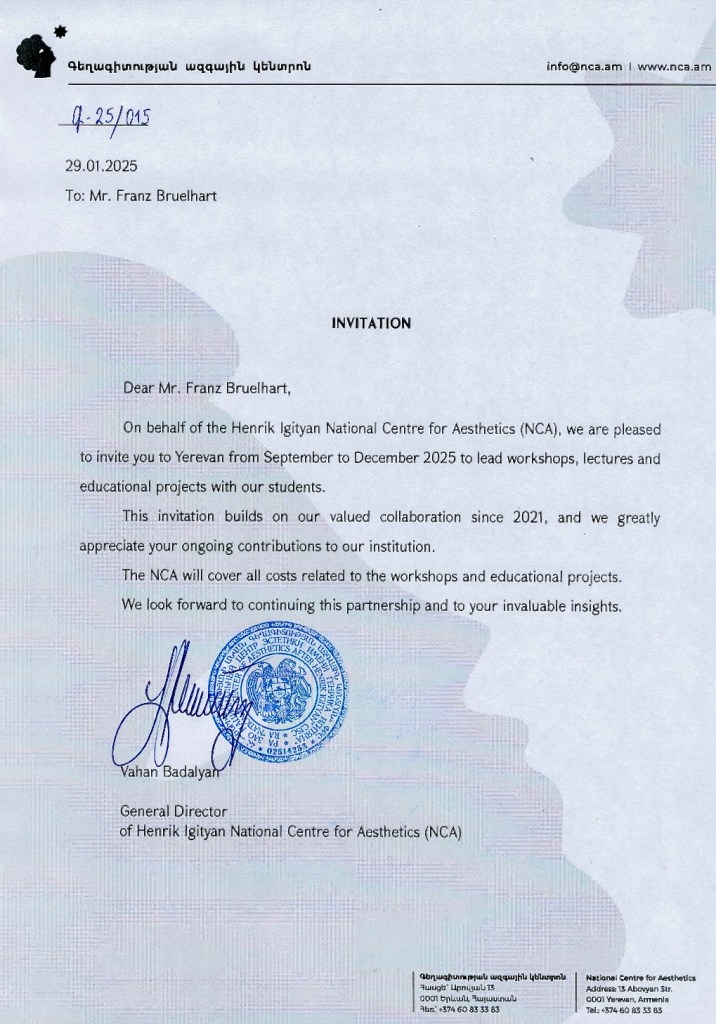 Ein Semester – Sept bis Dez – lang werde ich am NCA in Jerewan eine Gruppe von rund 15 Jugendlichen im Bereich Malerei/Kunst unterrichten. Werde sie dabei unterstützen ihre eigene Handschrift zu entwickeln und sich in der Welt der Kunst mit Selbstvertrauen zurechtzufinden.